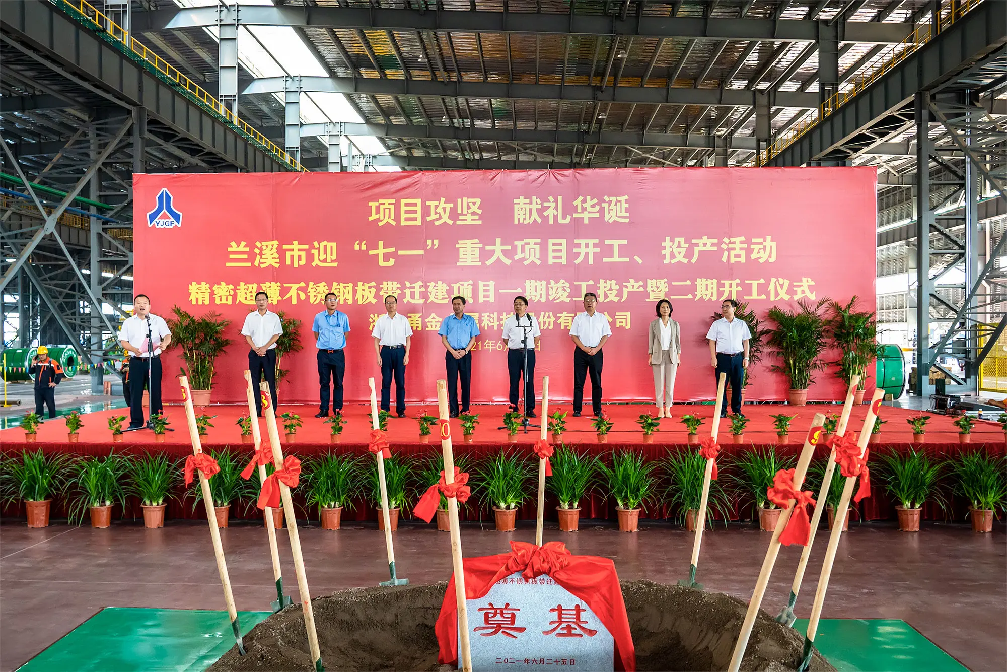 2021年6月25日,兰江之畔,横山脚下,甬金股份浙江迁建项目一期竣工投产暨二期开工仪式在浙江新厂区(灵洞乡耕头畈999号)隆重举行,现场出席仪式的主要嘉宾有兰溪市委书记陈峰齐、市长王新锋等政府主要领导,甬金股份董事长虞纪群、总经理周德勇,其他各单位主要负责人及代表。